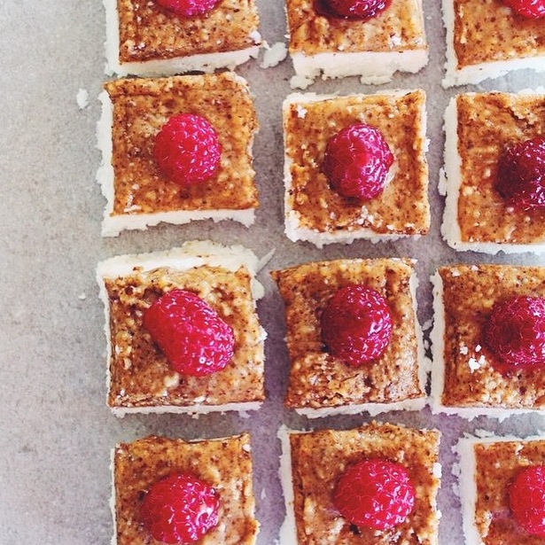 Process base ingredients until smooth and press into square pan. Spread almond butter on top and refrigerate. Cut and place raspberries on each square. Freeze or refrigerate.