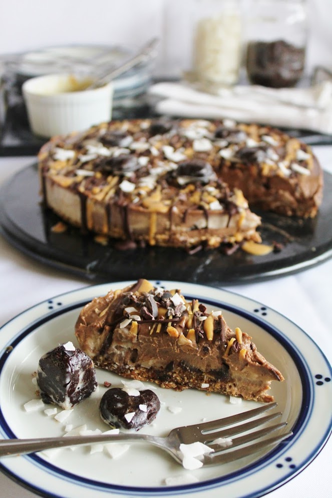 To make the cheesecake: blend all ingredients – EXCEPT cacao, peanut butter and salt – until very smooth. Add as little water as possible to keep your cheesecake creamy. If you don’t want to add any water, use some liquid sweetener or another banana. Now take out half the batter and put in a bowl. Add the cacao, pb and salt in the remaining batter that is still in your blender and blend until it’s incorporated. Now spread the vanilla layer and the chocolate layers on your crust, alternating a few times. Set in the freezer overnight and then drizzle with peanut butter and chocolate the next day. Enjoy!