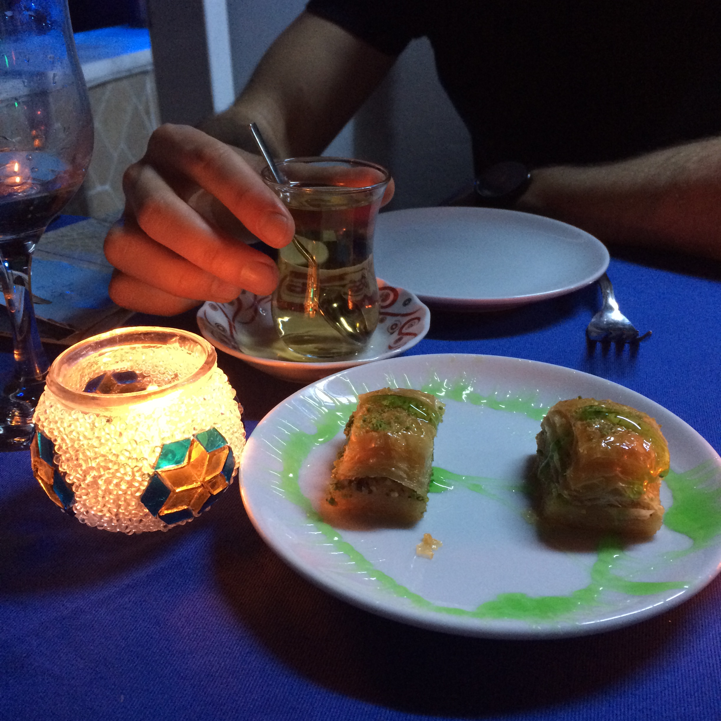 First impressions? Well that depends on your motion sickness levels and tolerance to fast and the furious style driving of a cabbie chatting on his phone and tooting at the ladies walking the street. We arrived at our Cheers Hostel near the Blue Mosque in Old Town Istanbul before getting completely ripped off on our first dinner with an outrageously priced seafood platter at Fish Home Ahhir Kapl in Sultanahmet. (I don’t even want to think about how much it cost but believe me when I say ripped off) At least it came with free apple tea, homemade sweet baklava and some Turkish bread and oil. The restaurant had great reviews and was in the top 3 for Istanbul on trip advisor (side note; my god they are all about the trip advisor over here – begging you to rate them after each mouthful of pide goodness). We had high hopes but personally wouldn’t go back. Coming from Western Australia…. I’ve had better seafood platters.