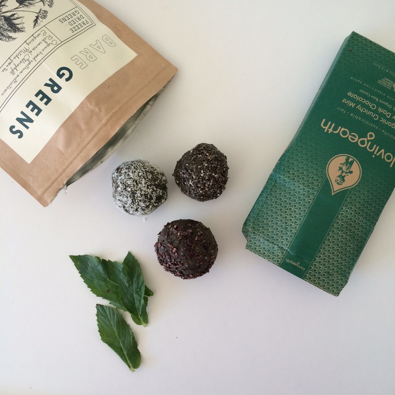 Place dates, sultanas and goji berries in food processor. Blend until smooth. Add almonds, cashews, cacao, peppermint essence, desiccated coconut and spirulina greens powder and whizz until further combined.