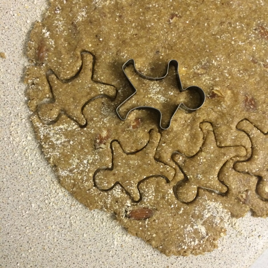 Sprinkle some flour over the bench and start rolling with a rolling pin or empty bottle. You want to roll it to just under 1cm thick. Use festive cookie cutters to make gingerbread men, xmas trees or stars etc. Place in oven on a lined baking tray for 10-12 minutes. The smaller ones will cook faster so keep an eye out after 8 minutes. Remove if they get too brown.