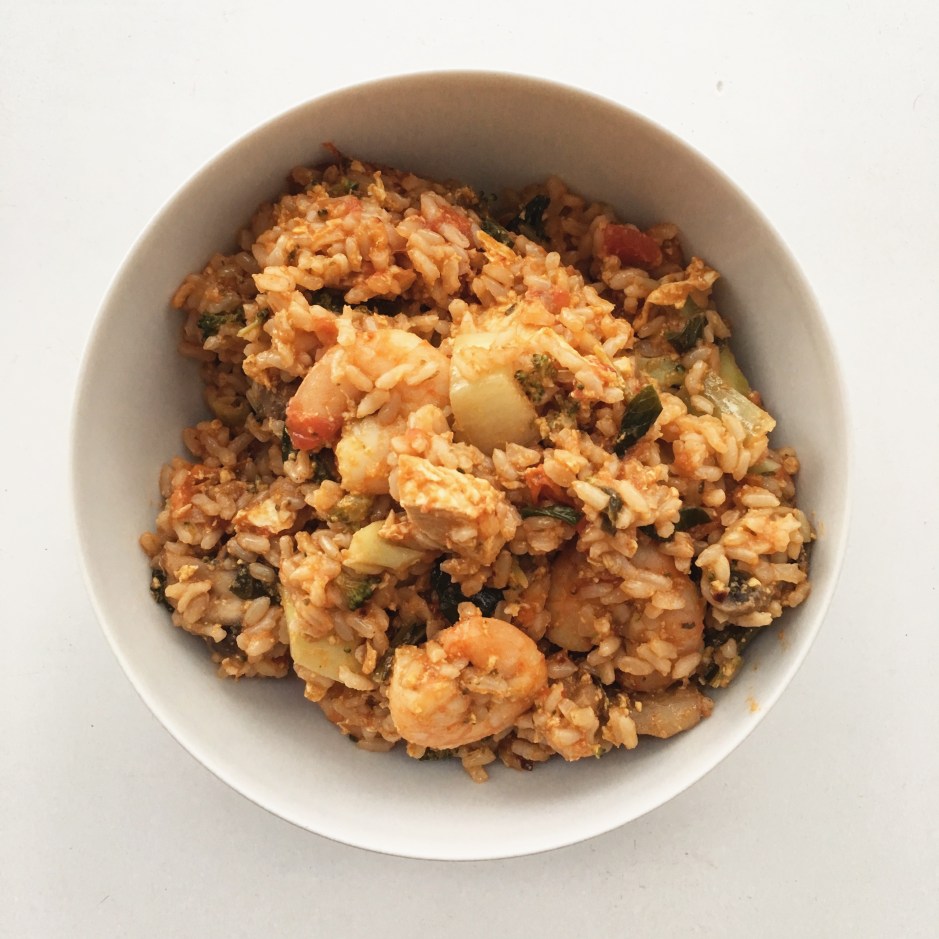 Friday night, just got home from the gym (I know I am amazing right?) and hunger strikes. Grab the ingredients on the way home and make this really weird hybrid version of a fried rice/paella. This took me 7 minutes and made enough for 4 serves. Cheap, easy and so good! Dinner sorted