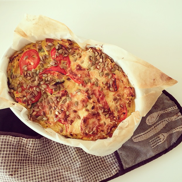 Pour mixture into lined baking dish. Top with sliced tomato and sprinkle with pepitas. Bake for 45 minutes or until skewer comes out clean.