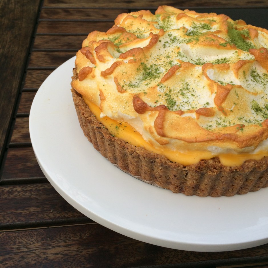 For the final layer of this epic cake / pie / tart you need to make the meringue. Either with some good old elbow grease or electric beaters beat the egg whites and rice malt until it starts to go white and glossy. You want it to hold its form and make peaks. About 3-5 minutes. Slop the meringue mixture onto the lemon curd layer. When it is covered use the whisk or a spoon to create some peaks for aesthetic purposes.